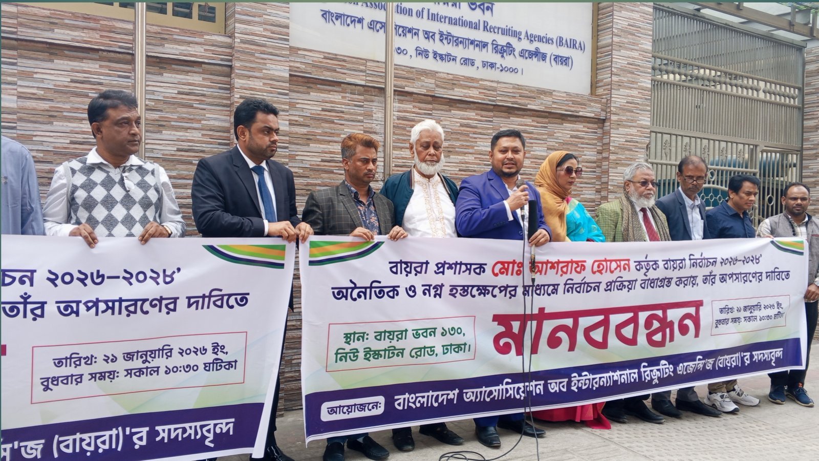 বাংলাদেশ এসোসিয়েশন অফ ইন্টারন্যাশনাল রিত্রুুটিং এজেন্সি’জ (বায়রা) এর প্রশাসনিক কর্মকর্তার জনাব মোঃ আশরাফ হোসেনের প্রশাসনের দাবিতে ২১ জানুয়ারি সকালের রাজধানীর স্কাটলের বায়রার কেন্দ্রীয় কার্যালয় সামনে মানববন্ধন করেন বায়রা সাধারণ সদস্যগণ।